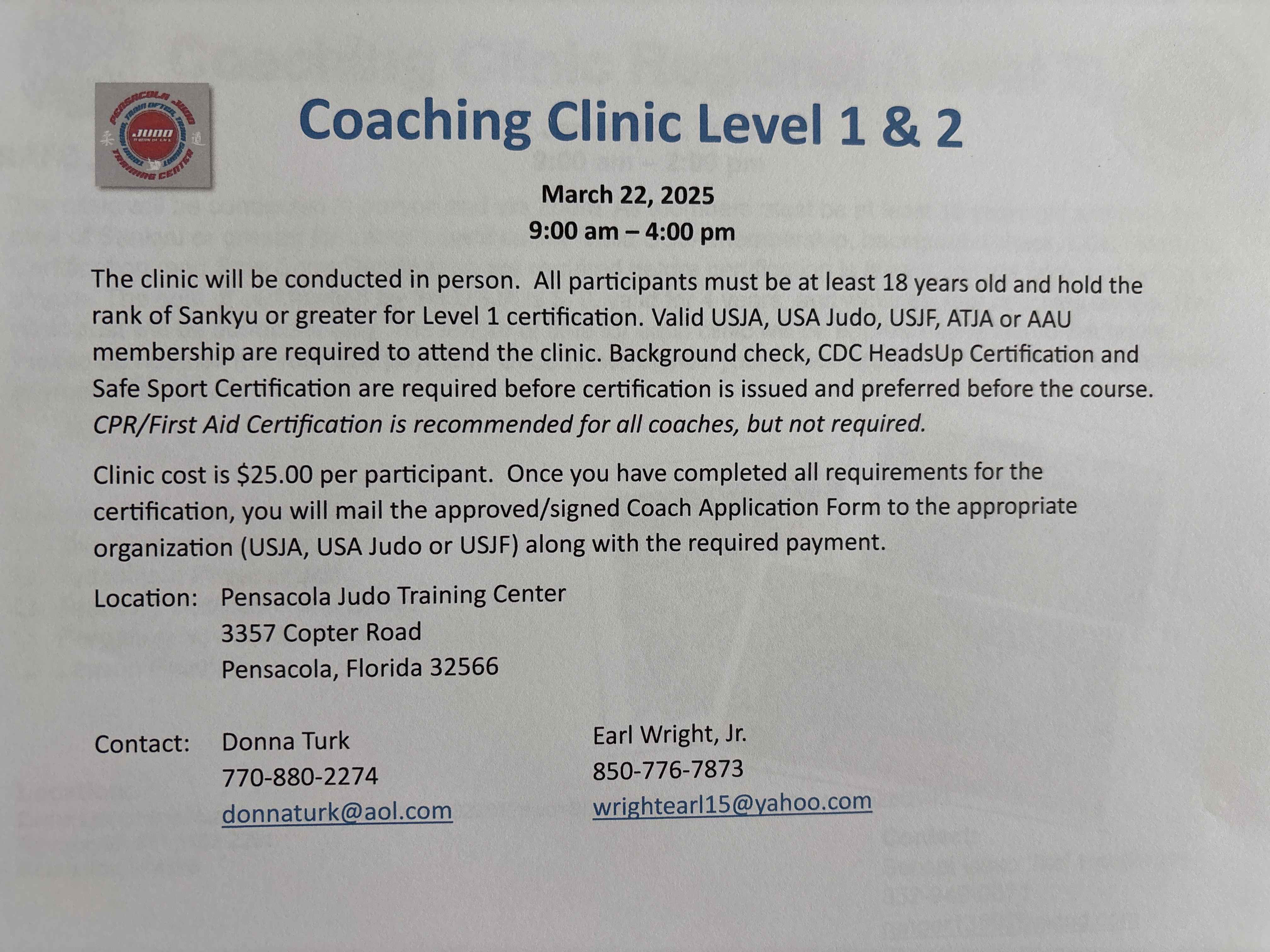 Coaching Clinic Level 1 and Level 2 - Pensacola Judo